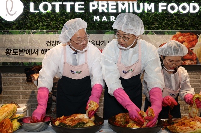 | ▲ 명현관 해남군수(왼쪽)와 강호진 신선식품부문장이 지난 29일 서울시 서초구에 위치한 롯데슈퍼 서초점에서 해남절임배추 판매촉진 행사 홍보를 위해 김장김치를 담구고 있다. / 해남군 제공 |