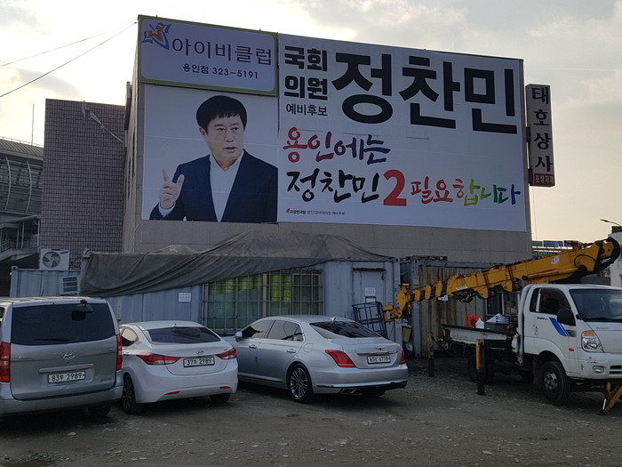 정 전 시장이 처인구 김량장동에 있는 선거사무실 건물 외벽에 내건 현수막은 모두 10개. 건물의 동서남북 모든 방향에 가로 11~16m, 세로 3~6m 짜리 대형 현수막을 내걸어 멀리서도 쉽게 눈에 띌 수 있도록 했다.