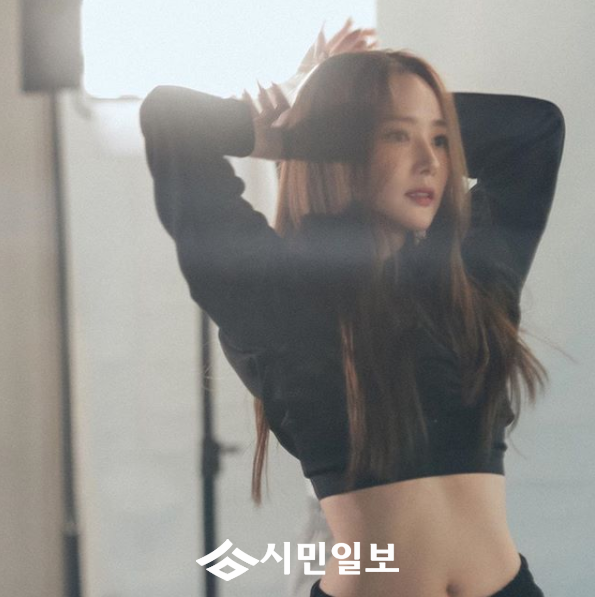 공개된 사진 속에서 박민영은 블랙 크롭티를 입은 채 두 팔을 들어 올리고 있다.