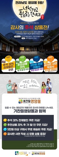 영암군 관계자는 “민족 최대명절인 한가위를 맞이해 기찬들 영암몰에서 영암군 대표 농·특산물로 구성된 다양한 선물세트를 준비하고 할인행사를 실시한다”며 “소비자분들의 많은 관심과 참여를 바란다.”고 밝혔다.