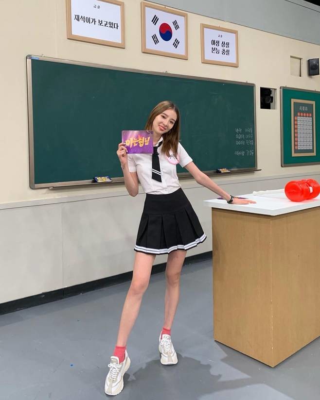 공개된 사진 속에는 아이린이 '아는형님' 이미지를 들고 미소를 짓고 있는 모습이 담겼다. 모델다운 엄청난 기럭지를 뽐내 시선을 사로잡는다.
