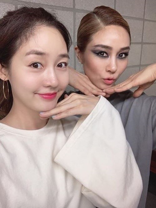 사진에는 안무 연습실 한쪽에서 판박이 포즈를 취하고 있는 옥주현과 성유리의 모습이 담겼다.