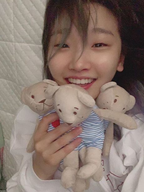 공개된 사진을 보면 이불에 누워 있는 박소담이 곰 인형 세 개를 들고 카메라를 응시하고 있다.
