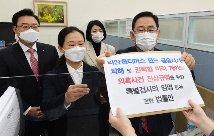 주호영 원내대표는 이날 '라임·옵티머스 펀드 금융사기 피해 및 권력형 비리게이트 의혹사건 진상규명을 위한 특별검사의 임명 등에 관한 법률안'을 대표발의 한다고 밝혔다.