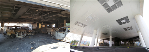 화재로 녹아내린 플라스틱 천장재(좌), 건축법 개정에 적합한 1급 불연 DMC 금속천장재(우)