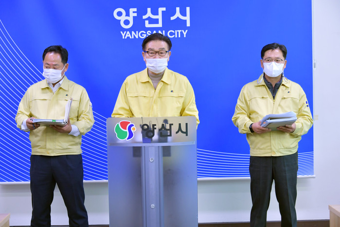 김일권 양산시장은 2일 오전 양산시청 프레스센터에서 관내 코로나19 확진자 발생에 따른 긴급 브리핑을 열고, 양산38·39·40번 확진자에 대한 발생경위 및 조치사항을 설명했다.