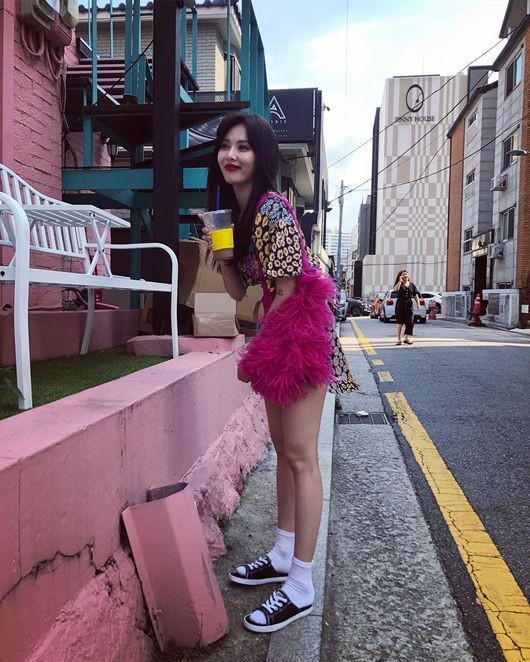 현아는 13일 자신의 인스타그램을 통해 사진 여러 장을 게재했다. 공개된 사진 속 현아는 분홍빛으로 물든 벽 앞에서 자유분방한 포즈를 취하며, '힙'한 매력을 뽐낸다. 특히 현아는 여러 색상이 배합된 꽃무늬 원피스를 입고, 시원하게 뒤태를 드러냈다.