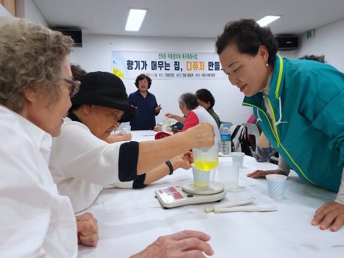 이에 따라 지난 9월30일 연희동주민센터에서 열린 교육에서 참여 노인들은 먼저 여러가지 향을 맡아 본 뒤, 자신의 마음에 드는 향으로 천연 디퓨저를 만들었다.