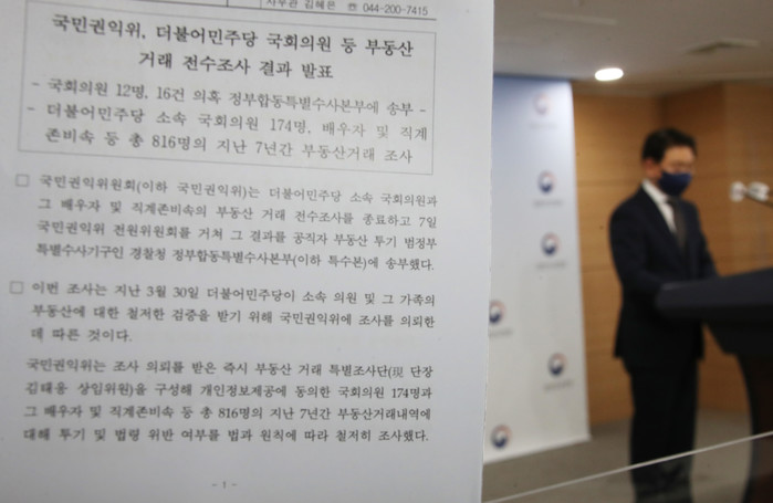 앞서 권익위는 민주당 의뢰로 의원 174명과 그 직계존비속 등 816명의 7년간 부동산 거래 내역을 전수조사했다.
