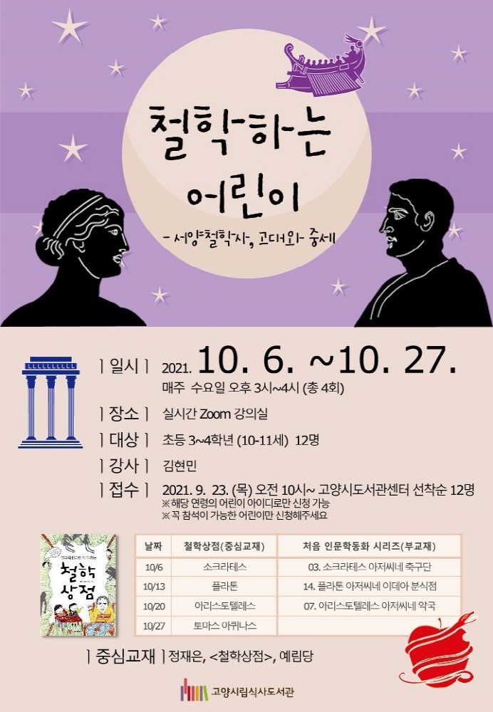 [고양=이기홍 기자] 고양시식사도서관이 오는 10월 6일부터 10월 27일까지 어린이를 위한 인문학 프로그램‘철학하는 어린이-서양철학사, 고대편’을 운영한다.