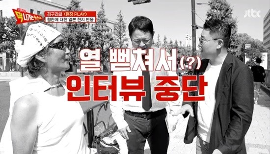 또 시민이 “한국인의 사고방식은 틀렸다. 일본이 가해자, 한국이 피해자라는 것은 틀렸다. 수탈하러 간 게 아니다. 한국에 철도를 놔줬다. 댐, 발전소, 병원, 학교, 공장...”이라고 망언을 계속하자 김구라는 “저런 잘못된 생각을 가진 분이 참 많다”며 인터뷰를 중단했다.
