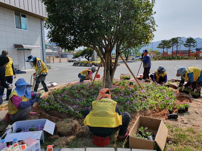 | ▲ 가로수 주변에 꽃을 심고있는 노인들. (사진제공=영암군청) |
