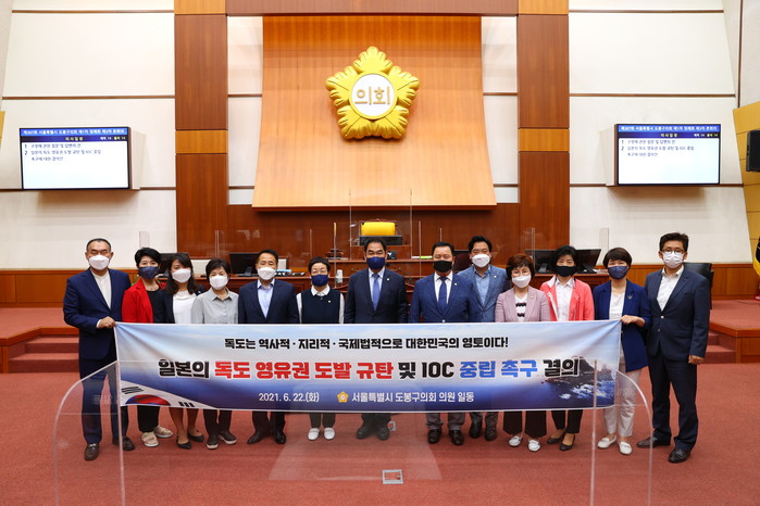 | ▲ ‘일본의 독도 영유권 도발 규탄 및 IOC 중립 촉구에 대한 결의안’을 채택한 도봉구의원들이 기념촬영을 하고 있다. (사진제공=도봉구의회) |