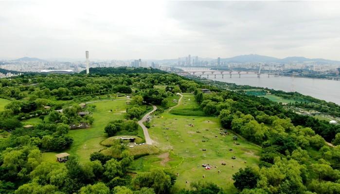 | ▲ 드론으로 촬영한 노을캠핑장 전경. (사진제공=마포구청) |