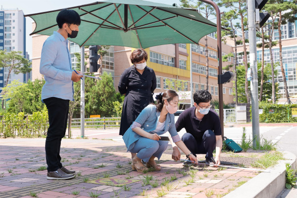 진선미 서울 강동구의원(강일동, 고덕1·2동)이 최근 강명초등학교 근처에서 발생한 자전거 거치대 관련 민원을 접수하고 해결방안을 마련하기 위해 현장에서 민원인을 만나 요지를 파악한 후 자전거 거치대 추가 설치 가능 여부를 확인했다. 사진은 자전거 거치대 설치를 위해 논의를 하고 있는 진 의원(앞쪽 가운데)와 관계자들의 모습. (사진제공=강동구의회)