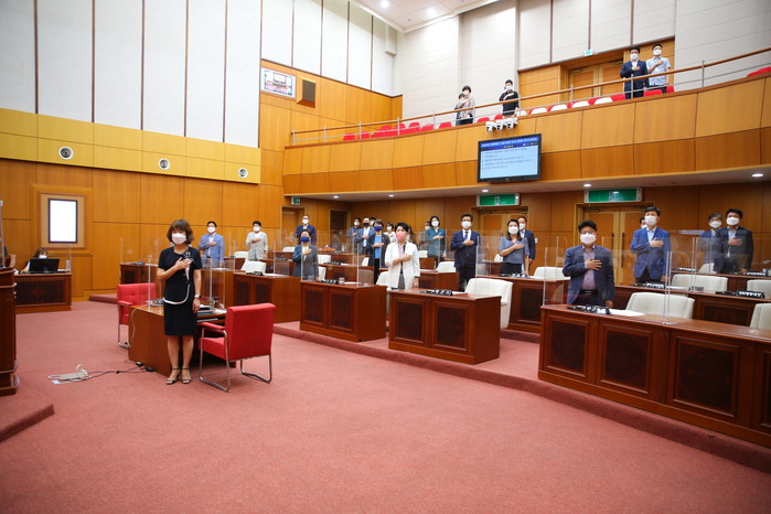 박진식 의장은 개회사를 통해 “6월은 현충일과 6.25전쟁일을 포함한 호국 보훈의 달이다. 조국과 민족을 위해 순국하신 선열들의 숭고한 얼이 우리 후손들에게 길이 이어져 빛날 수 있도록 우리 모두 각자의 위치에서 맡은 바 책임과 임무를 다해야 할 것이며, 그 유가족의 아픔을 보듬고 삶을 보살피는 일은 현재를 사는 우리의 도리이다”고 말했다.