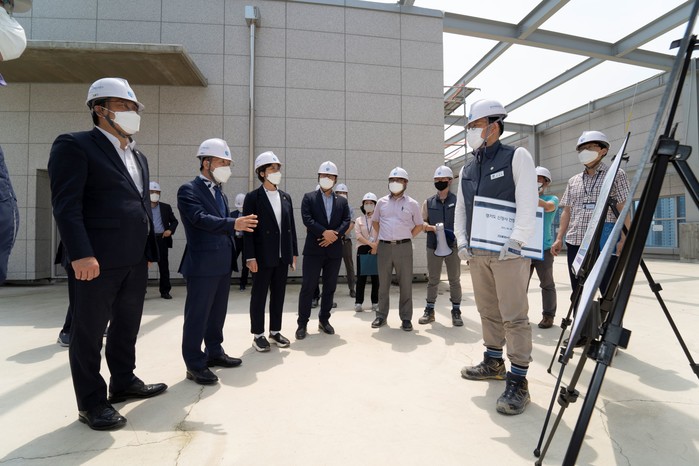 | ▲ 광교 도의회 신청사 공사현장을 방문한 의회운영소위원회 위원들이 관계자로부터 사업 추진 현황을 설명 듣고 있다. (사진제공=경기도의회) |