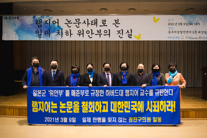 [시민일보 = 여영준 기자] 서울 광진구의회(의장 박삼례)가 최근 동부여성발전센터 2층 대강당에서 광진포럼과 함께 '램지어 논문사태로 본 일제 치하 위안부의 진실'이라는 제목으로 포럼을 개최했다.