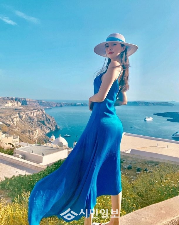김유지는 자신의 인스타그램에 "#santorini"라는 내용과 함께 사진을 게재했다.