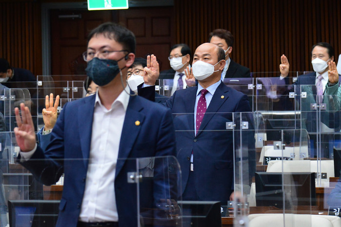 | ▲ 황인구 의원(강동4, 더불어민주당)이 제299회 서울시의회 임시회 제3차 본회의에서 ‘미얀마 군부 쿠데타 규탄 및 구금자 석방, 민주주의 질서 회복 촉구 결의안’에 대해 기립표결을 진행하고 있다. (사진제공=서울시의회) |