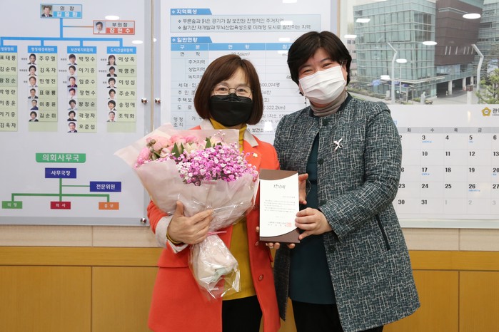 | ▲ 이상옥 의원(왼쪽)이 감사패를 들고 기념촬영을 하고 있다. (사진제공=관악구의회) |