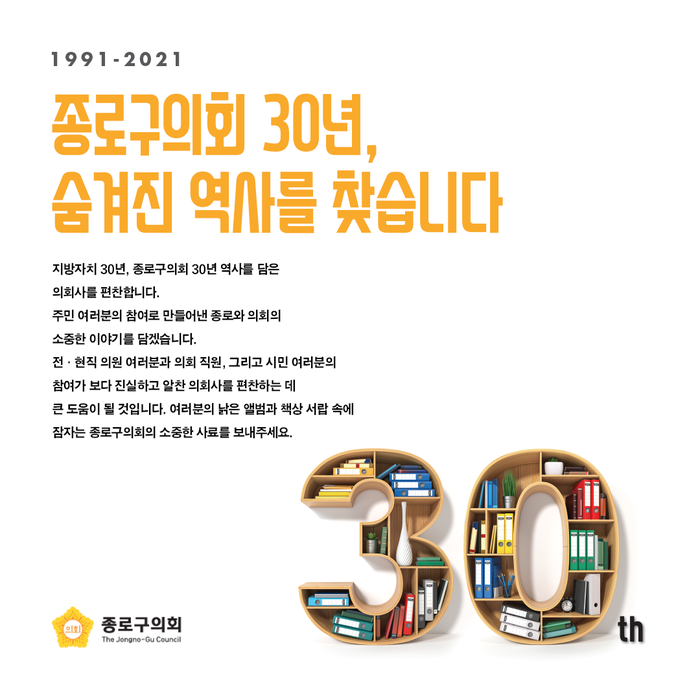 [시민일보 = 이대우 기자] 서울 종로구의회(의장 여봉무)가 ‘종로구의회 30년사 발간’에 맞춰 사료수집 공모전을 열고 오는 6월30일까지 접수를 받는다.