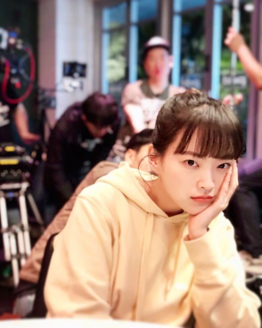 사진 속 천우희는 '멜로가 체질' 촬영 장에서 연노랑 후드티를 입고 턱을 괸 채 카메라를 바라보고 있다.
