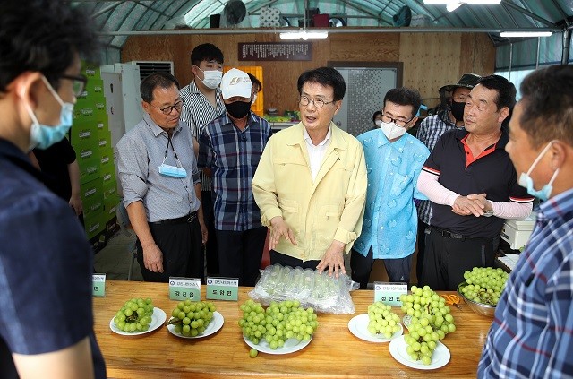 | ▲ 이승옥 강진군수(가운데)가 지난 8일 성전면 한 농장에서 열린 강진샤인머스캣 품평회장을 찾아 샤인머스켓 연구회원들과 포도 생산에 대한 의견을 나누고 있다. / 강진군 제공 |