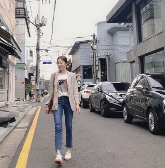 사진 속 유다솜은 거리를 거닐며 미소를 짓고 있다. 다리를 벽에 올리는 코믹한 포즈를 취한 가운데 날씬한 몸매가 돋보인다.