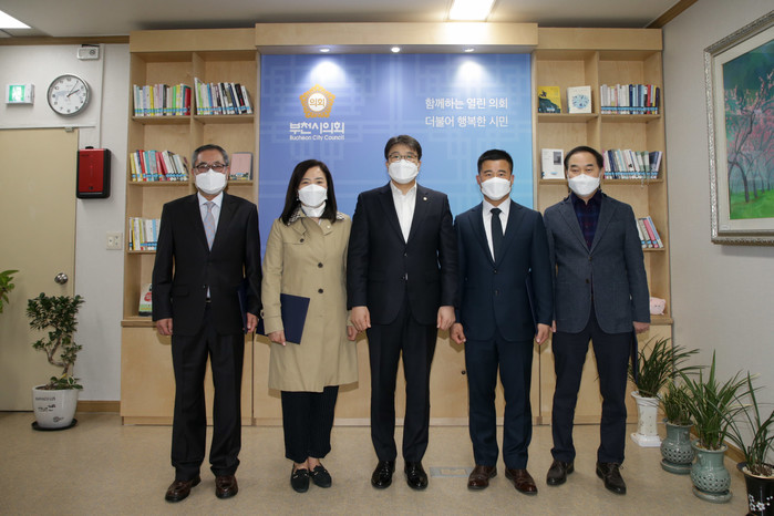| ▲ (왼쪽부터) 이승표 전 교육사업단장, 양정숙 시의원, 강병일 의장, 김기덕 세무사, 허모 전 교통사업단장이 위촉장 수여 기념촬영을 하고 있다. (사진제공=부천시의회) |