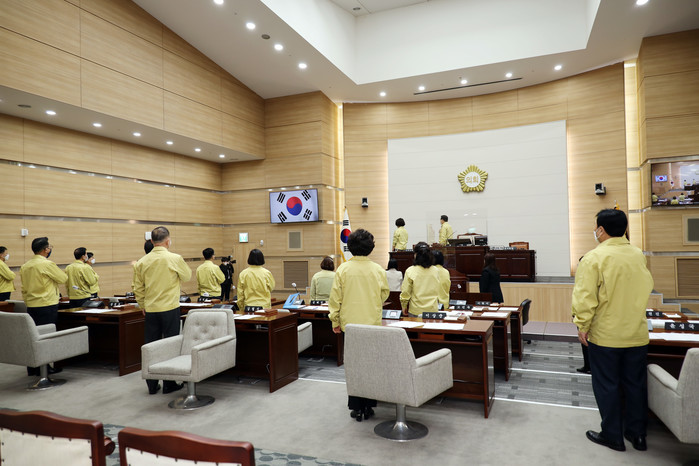| ▲ 제263회 임시회 개회식에서 의원들이 국민의례를 하고 있는 모습. (사진제공=용산구의회) |