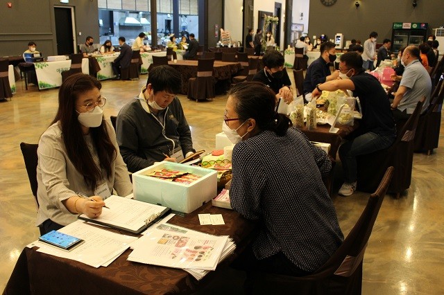 | ▲ 해남의 우수한 농수특산물의 판로 개척과 품질개선, 마케팅경쟁력 향상을 위해 해남군과 전남창조경제혁신센터 공동 주관으로 4일 개최된 '2021 찾아가는 우수농수특산품 품평회' 현장 상담 모습 / 사진=해남군 제공 |