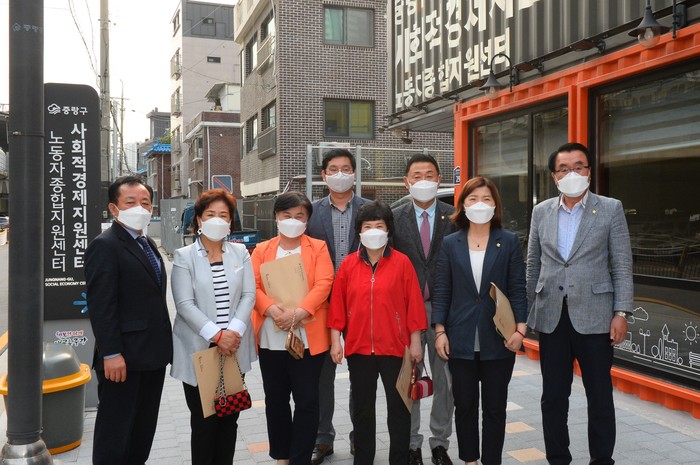 | ▲ 사회적경제지원센터를 찾은 중랑구의원들이 기념촬영을 하고 있다. (사진제공=중랑구의회) |