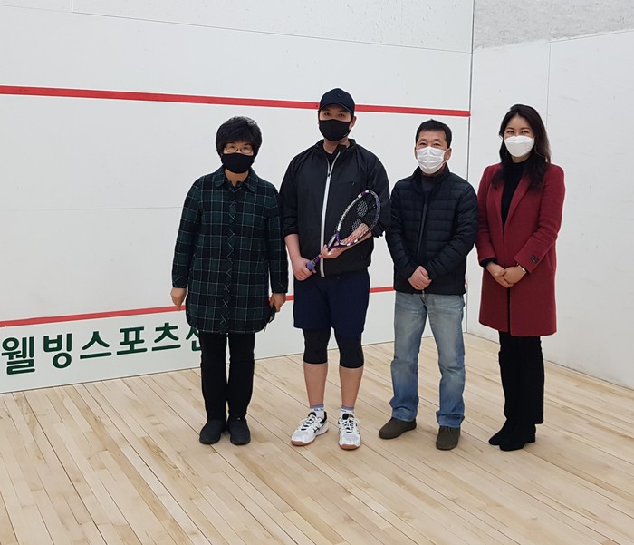 | ▲ 유인애 의원이 보수공사가 완료된 강북웰빙스포츠센터 스쿼시장을 방문해 현장을 둘러보고 관계자들과 기념촬영을 하는 모습. (사진제공=강북구의회) |