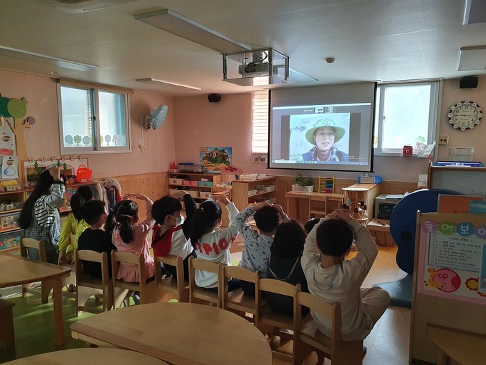 | ▲ 어린이집 아이들이 줌 수업을 통해 유아 숲 체험을 하고 있다.(사진제공=관악구청) |