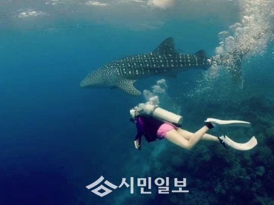 사진 속 오정연은 바다 속을 항해하며 고래상어와 인사를 나누고 있는 모습으로 감탄을 자아냈다.