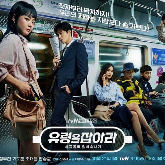 사진은 드라마 '유령을 잡아라' 공식 포스터로 문근영은 지하철을 배경으로 가장 왼편에 서서 카메라를 바라보고 있다. 문근영의 오른 쪽으로 지하철 문 앞에 기대있는 김선호, 의자에 앉은 정유진 등이 보인다.