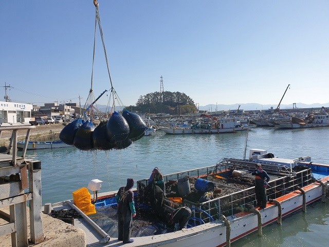 | ▲ 지난 25일 해남 송지면 앞 바다 김양식장에서 채취된 올 가을 첫 물김이 위판을 위해 기증기로 운반되고 있다. / 사진=해남군 제공 |