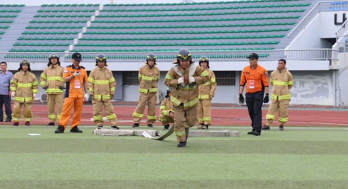 이날 의용소방대원들은 기술경연대회 3종목(소방호스끌기, 수관연장 및 방수, 개인장비 착용 및 릴레이)에서 소속 119안전센터 단위 12개 팀으로 경연하여 평소 갈고 닦은 소방기술을 아낌없이 뽐냈다.