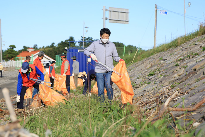 맹정호 충남 서산시장이 18일 부석면 새마을남·여지도자협의회, 천수만생태관광 추진협의회, 농촌지도자회, 청년회, 서산 시니어클럽, 간월도 지역주민 등의 사회단체들과 부석면 천수만 일원(간월도)에 집중호우 및 강풍으로 생긴 해양쓰레기 수거활동을 펼쳤다. 사진은 쓰레기 수거를 하고 있는 맹 시장의 모습. (사진제공=서산시청)
