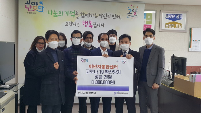 [고양=이기홍 기자] 고양시는 이민자통합센터와 지난 26일 고양시청에서 고양시 취약가구의 코로나 19 감염 예방을 위해 '코로나 19 감염 예방을 위한 성금전달식'을 가졌다.