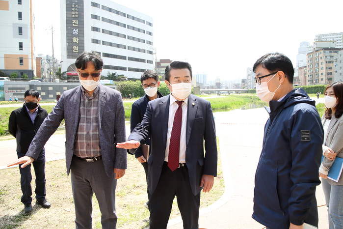 이날 박 의장은 관계 공무원들과 함께 코로나19 상황을 감안해 담당공무원으로부터 사업추진 경과와 공사일정 등을 간략히 보고 받은 후 산책로 일대를 직접 확인하며 개선할 점과 사업추진 방향 등을 모색했다.