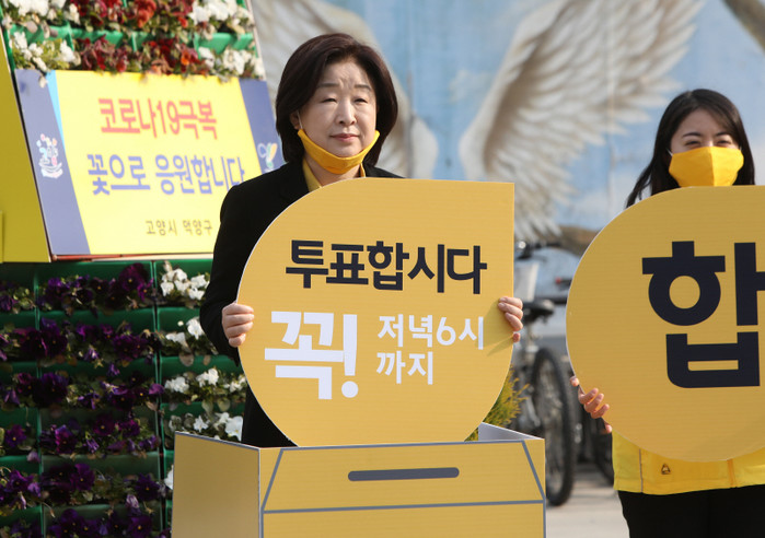 사전투표를 마친 정의당 심상정 대표는 이날 자신이 출마한 지역구인 경기 고양시 화정역 광장에서 투표 독려 캠페인을 벌였다.