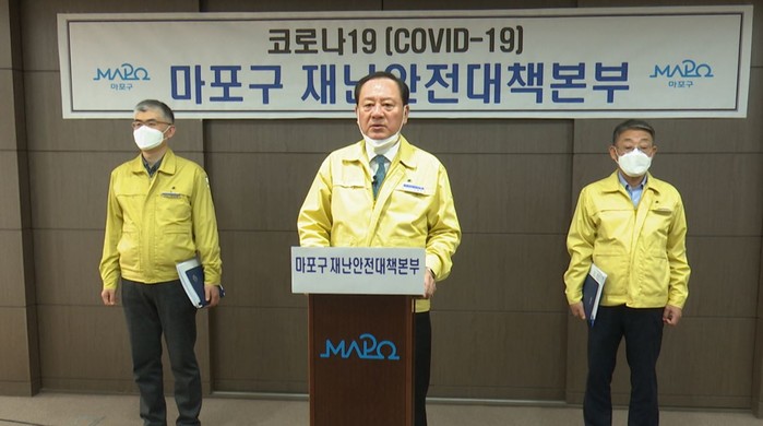 유동균 서울 마포구청장이 최근 구청 중회의실에서 코로나19(우한폐렴) 위기경보가 '심각' 단계로 격상됨에 따라 관련 브리핑을 열고 지역내 확진자 현황과 추진대책 등에 대해 발표했다. 사진은 유 구청장(가운데)이 브리핑을 하는 모습. (사진제공=마포구청)