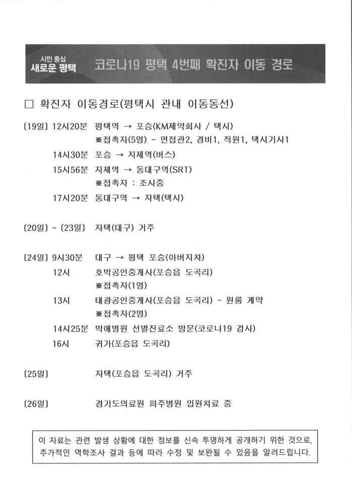 시는 확진자의 동선에 대해 ▲19일 12시20분 평택역에서 포승읍 KM제약회사 택시로 이동 ▲19일 14시30분 포승읍에서 지제역 버스로 이동 ▲19일 15시56분 지제역에서 동대구역 SRT로 이동 ▲20일~23일 대구 자택 ▲24일 12시 대구에서 포승읍 호박공인중개사 자가용 이동 ▲13시 태광공인중개사 ▲14시25분 박애병원 선별진료소 방문 후 25일까지 포승읍 도곡리 자택에서 머무르다 26일 확진 판정을 받았다고 설명했다.