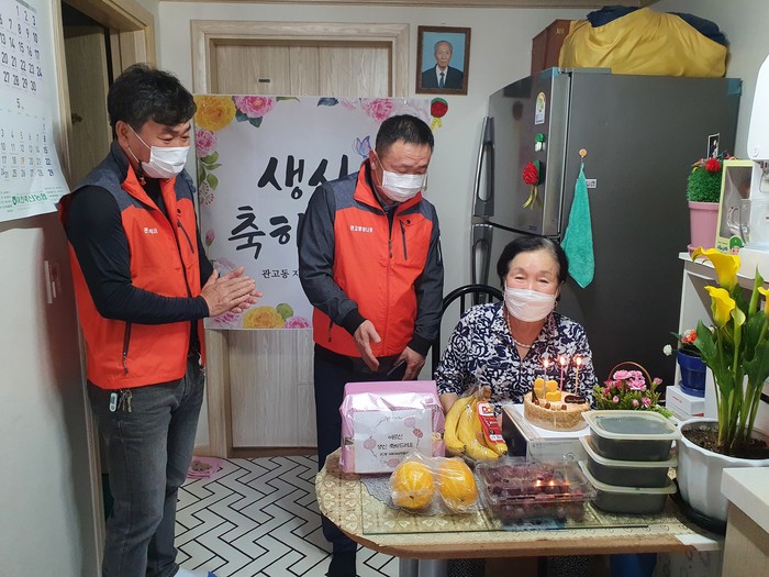 경기 이천시 관고동 지역사회보장협의체가 11일 80세 이상 저소득층 홀몸노인 약 20명을 대상으로 생일상을 차려주는 '찾아가는 생신상' 사업을 시작했다. 사진은 협의체 위원들이 이달 생일을 맞이한 노인을 방문해 생일상을 차려주고 축하하는 모습. (사진제공=이천시청)