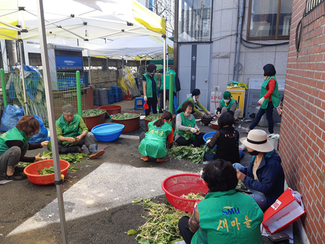 경기 의정부시 장암동이 지난 6~7일 양일간 새마을부녀회 주관으로 코로나19로 어려움을 겪고 있는 홀몸노인 등 소외계층을 위한 '사랑의 김치나눔 행사'를 열고 150박스의 김치를 만들었다. 사진은 김치를 만들고 있는 부녀회원들의 모습. (사진제공=의정부시청)