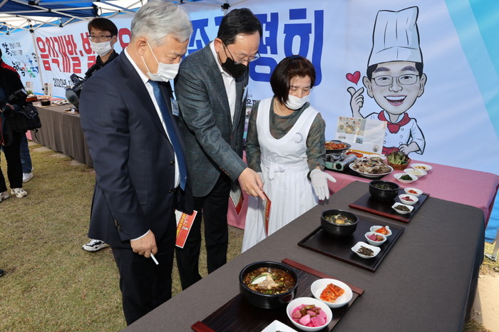 | ▲ 명현관 군수(가운데)와 김병덕 해남군의회의장이 해남미남축제 음식개발 용역을 통해 선보인 해남해우탕을 살펴보고 있다. / 사진=해남군 제공 |