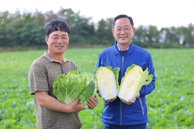 | ▲ 명현관 해남군수(우측)가 본격적인 김장철을 앞두고 배추 재배농민과 함께 속이 꽉 차고 노란 우수품질의 해남 김장배추를 홍보하고 있다. / 사진=해남군 제공 |