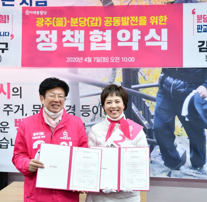 김 후보와 이 후보는 이날 교통망 등 분당, 광주 지역 발전을 위한 방안을 논의하고 협약식에서 ‘지하철 8호선 연장사업의 성공적 추진’, ‘수서-광주 복선전철사업의 조기 착공’, ‘분당구 율동공원과 광주시 신현리 간 도로 건설’ 등 분당과 광주 지역민의 교통문제를 해결할 방안을 발표하고 공동 노력할 것을 약속했다.